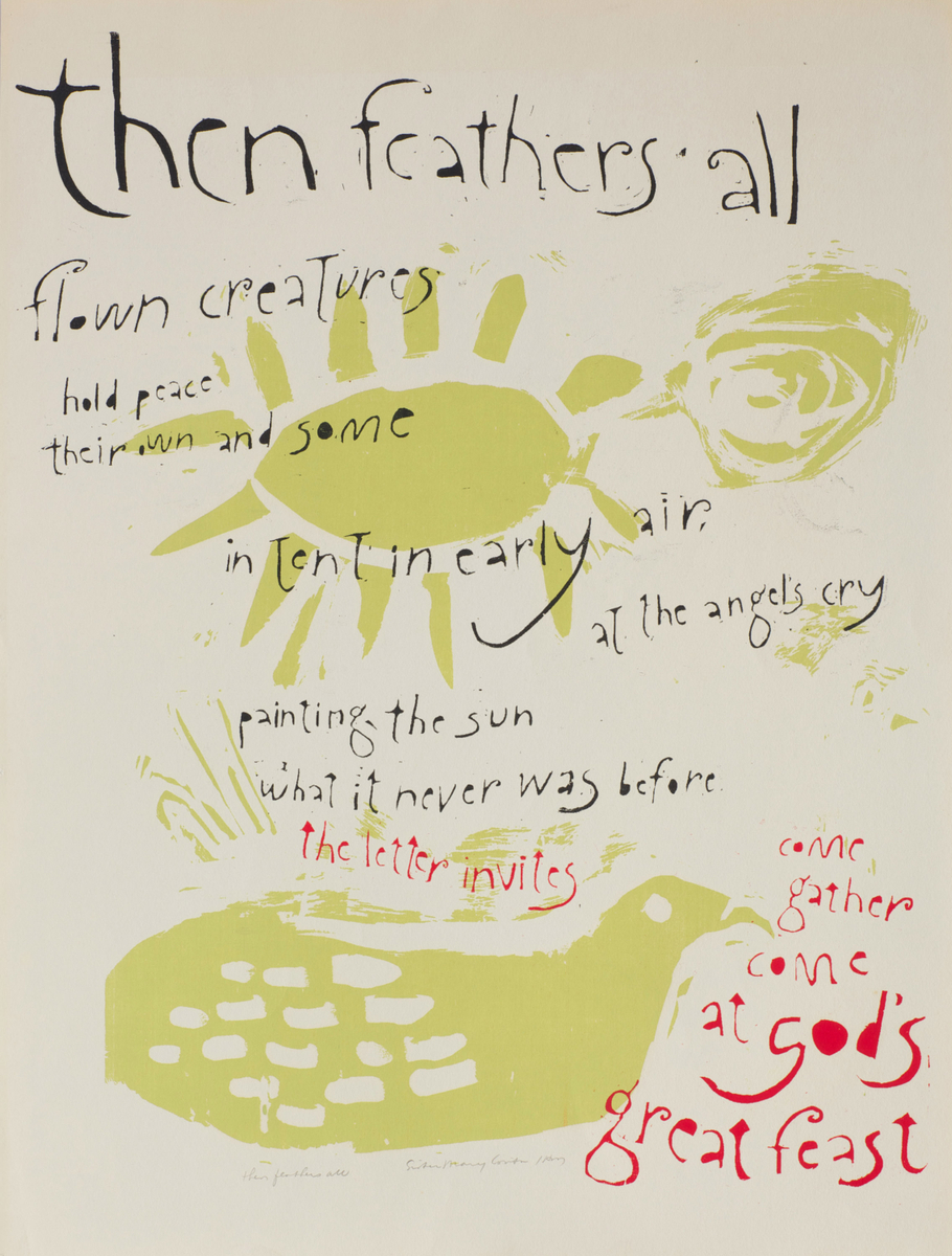 then feathers allflown creatures hold peace their own and somein tent in early airat angel's cry painting the sunwhat it never was beforethe letter invitescome gather come at god's great feast