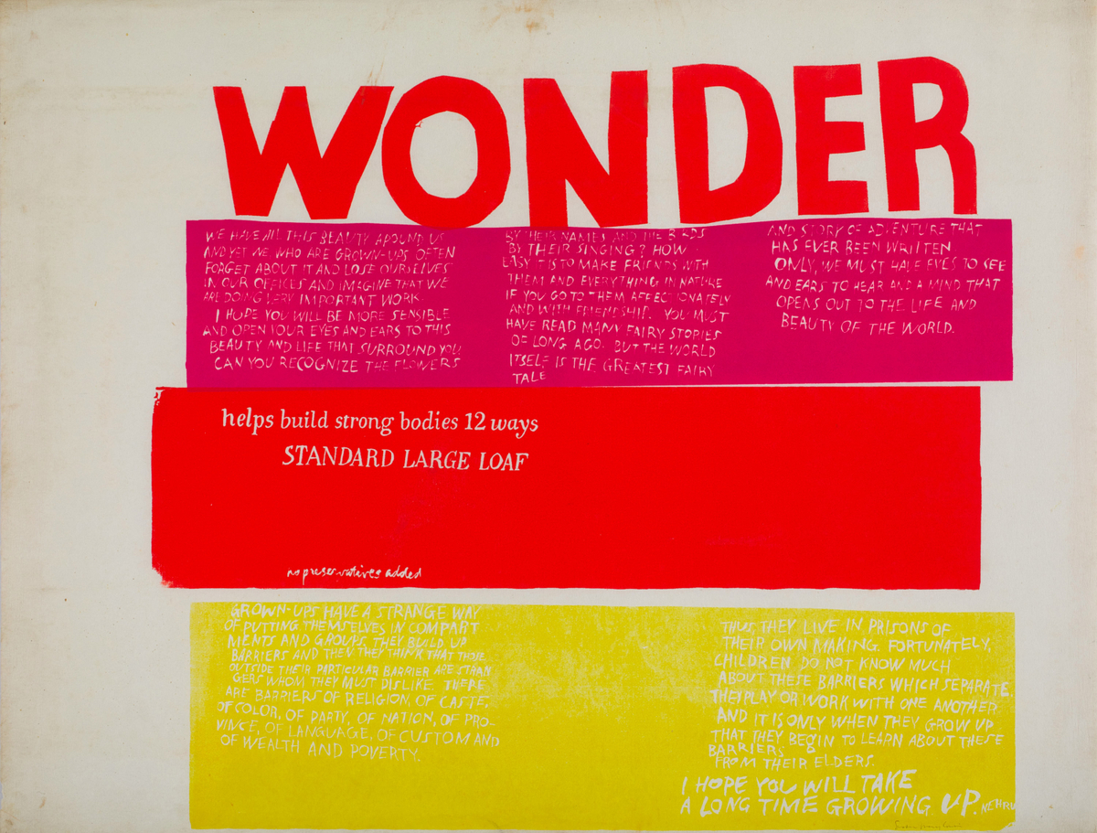 We have all this beauty around us and yet we, who are grown-ups, often forget about it and lose ourselves in our offices and imagine that we are doing very important work. I hope you will be more sensible and open your eyes and ears to this beauty and life that surround you. Can you recognize the flowers by their names and the birds by their singing? How easy it is to make friends with them and everything in nature if you go to them affectionately and with friendship. You must have read many fairy stories of long ago. But the world itself is the greatest fairy tale and story of adventure that has ever been written only, we must have eyes to see and ears to hear and a mind that opens out to the life and beauty of the world. Grown-ups have a strange way of putting themselves in compartments and groups. They build up barriers and then they think that those outside their particular barrier are strangers whom they must dislike. There are barriers of religion, caste, of color, of party, of nation, of province, of language, of custom and of wealth and poverty. Thus, they live in prisions of their own making. Fortunately, children do not know much about these barriers which separate. They play or work with one another and it is only when they grow up that they begin to learn about these barriers from their elders. I hope you will take a long time growing up. WONDER helps build strong bodies 12 ways STANDARD LARGE LOAF no preservative added