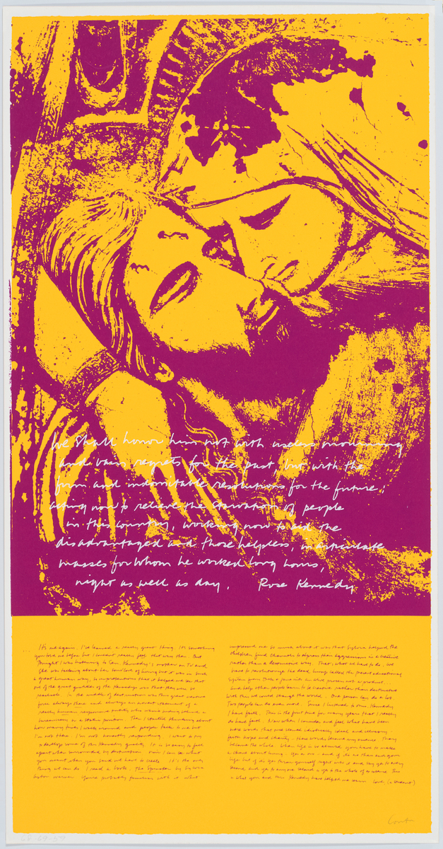 ...It's me again. I've learned a really great thing. It's something you told me before but I couldn't really feel that way then. But tonight I was listening to Sen. Kennedy's mother on TV and she was talking about her son's love of living but it was in such a great human way, so unpretentious that it helped me see that one of the great qualities of the Kennedy's was that they were so reachable. In the middle of destruction was this great creative force always there and always an honest statement of a really human responsive entity who wasn't hiding behind a bureaucracy or a static position. Then I started thinking about how many times I walk around and people talk to me but I am not there. I'm not honestly responding. I want to try to develop some of the Kennedy quality. It is so easy to fall apart when surrounded by destruction. Now I can see what you meant when you said we have to create. It's the only thing we can do. I read a book, The Spinster by Sylvia Baton Warner. You're probably familiar with it. What impressed me so much about it was that Sylvia helped the children find channels to express their aggressions in a creative rather than a destructive way. That's what we have to do. We have to revolutionize the dead lump called the present educational system from Dick & Jane into an alive process not a product...And help other people learn to be creative rather than destructive. With this we could change the world. One person can do a lot. Two people can do even more. Since I listened to Mrs. Kennedy I have faith. This is the first time for many years that I really do have faith. Now when I consider and feel what have been mere words that once seemed idiotically ideal and illusory---faith, hope and charity---these words become my essence. They become the whole. When life is so absurd you have to make a choice about living---Yes or no---and if it's no then end your life but if it is yes throw yourself right into it and say yes to every second and yes to any one second is yes to the whole of existence. This is what you and Mrs. Kennedy have helped me learn. Love, (a student)