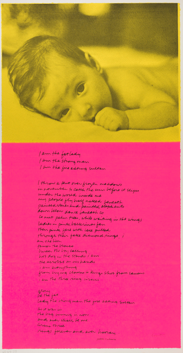 I throw a tent over frozen meadows in november to catch the sun before it slips under the world inside me my people fly half naked beneath painted skies and painted elephants down below dance beneath is coconut palm trees, while waiting in the wings ladies in pink ballerinas fan their pink faces with lace pulled through their fake diamond rings, i am the lion tamer the bronco buster the boy calling hot dog in the stands i am the acrobat on his hands i am everything from crying clowns to kings shot from canons i am the three rings circus