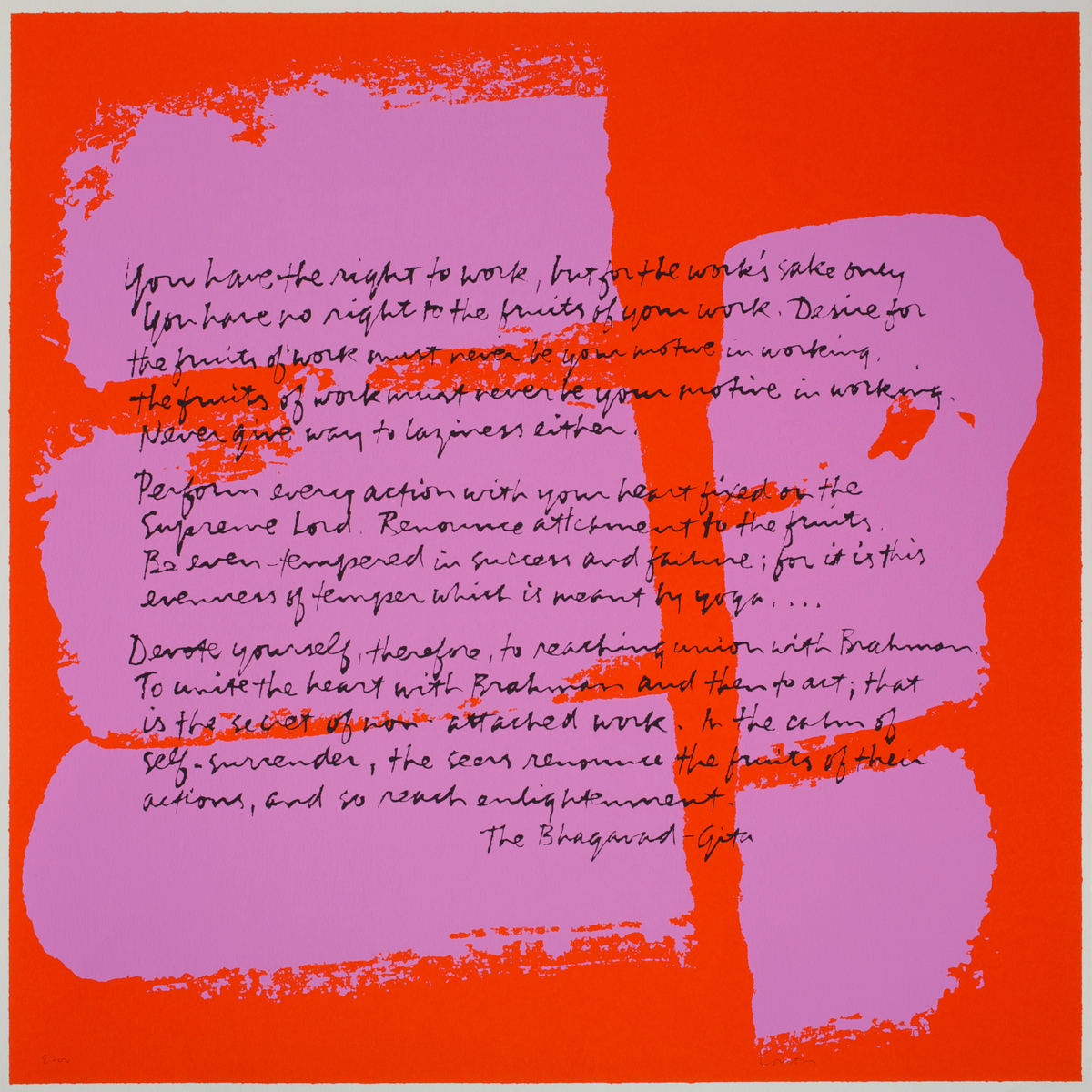 You have the right to work, but for the work's sake only You have no right to the fruits of your work. Desire for the fruits of work must never be your motive in working. The fruits of work must never be your motive in working. Never give way to laziness either.Perform every action with your heart fixed on the supreme Lord. Renounce attachment to the fruits. Be even-tempered in success and failure; for it is this evenness of temper which is meant by yoga....Devote yourself, therefore, to reaching union with Brahman. To unite the heart with Brahman and then to act; that is the secret of non-attached work. In the calm of self-surrender, the seers renounce the fruits of their action, and so reach enlightenment. The Bhagavad-Gita